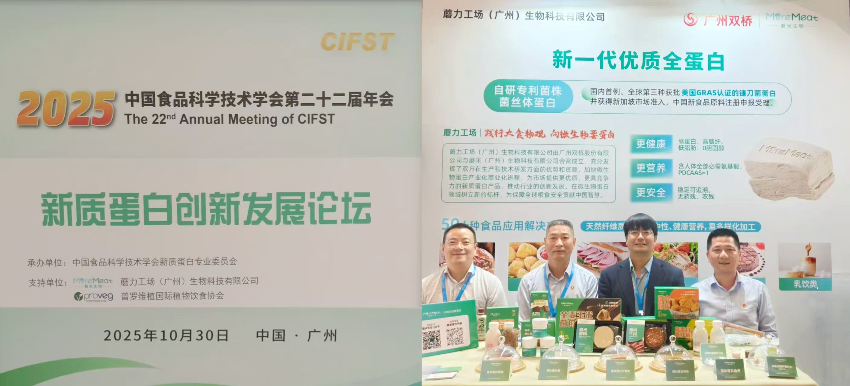 10月29-31日,中国食品科学技术学会第二十二届年会在广州召开。本次会议聚焦食品科技前沿与产业创新发展,就2025食品科学前沿热点问题、人工智能与食品、新质蛋白创新发展、乳品深加工技术创新与产业发展、植物基食品创新发展、食品风味科学前沿等内容设立专题,助力食品产业高质量发展。蘑力工场公司以微生物蛋白为主导产业,是全国首家微生物蛋白规模化生产的公司,非常契合本次年会主题,受邀参加会议并成为新质蛋白创新发展论坛的支持单位。会议当天,蘑米公司创始人蒋先芝、蘑力工场公司冯文清董事等团队出席会议并与同行们进行技术交流。